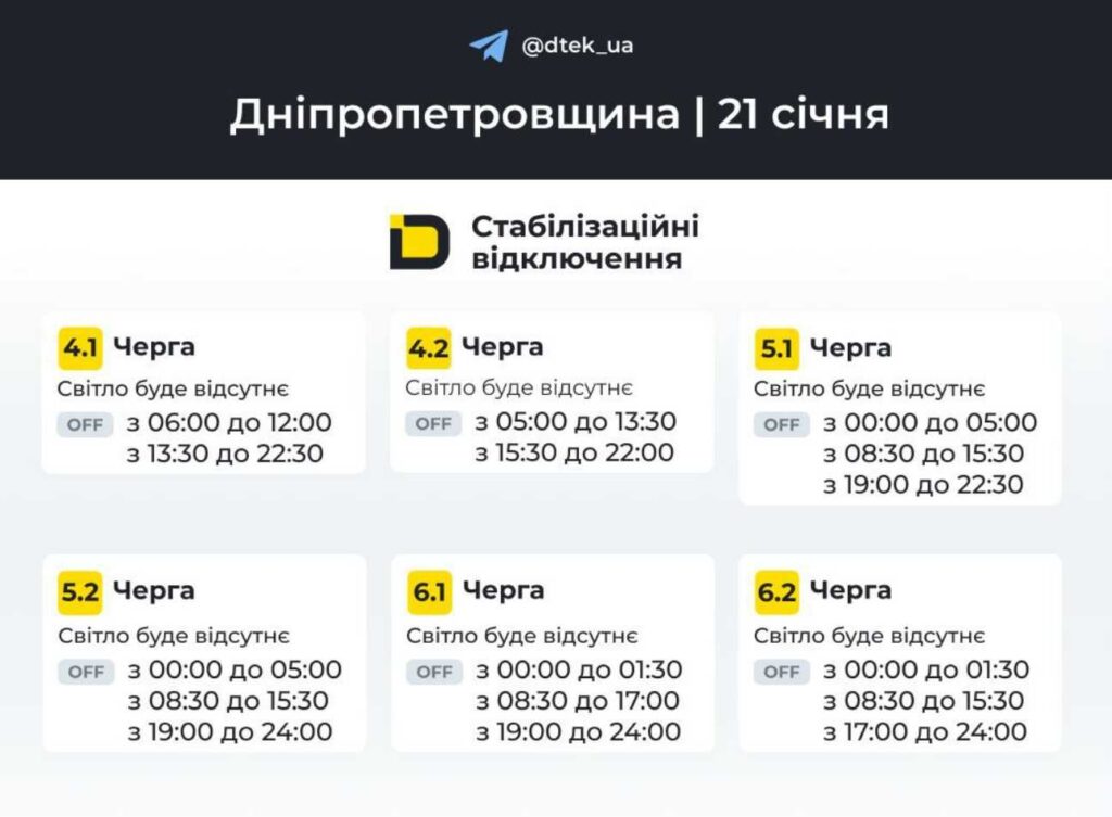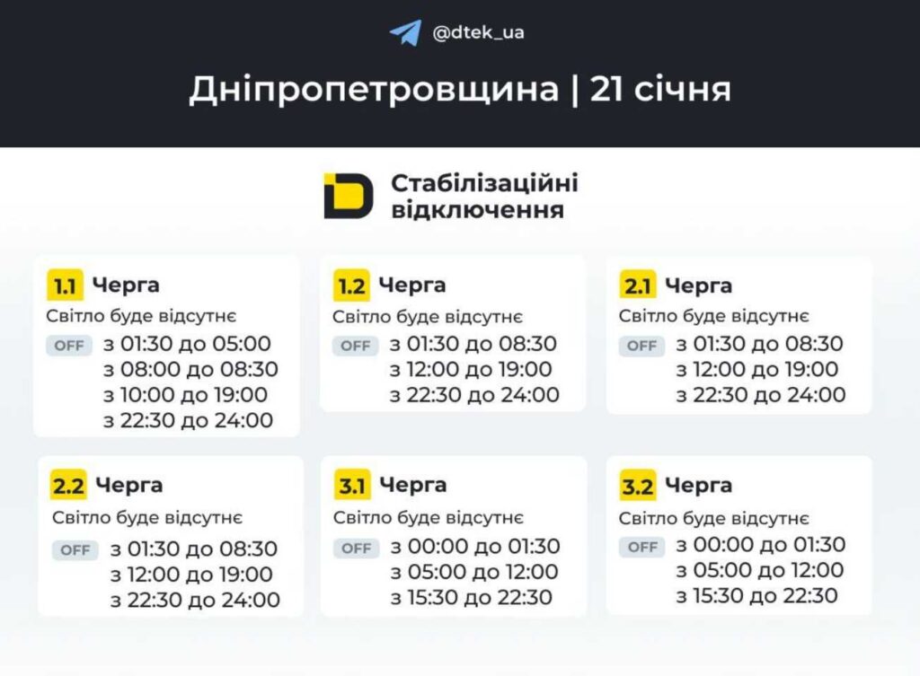 У середу, 21 січня 2026 року, у Дніпрі та області заплановані планові відключення електроенергії. Енергетики оприлюднили оновлені графіки відключень для житлових будинків і комерційних об’єктів.